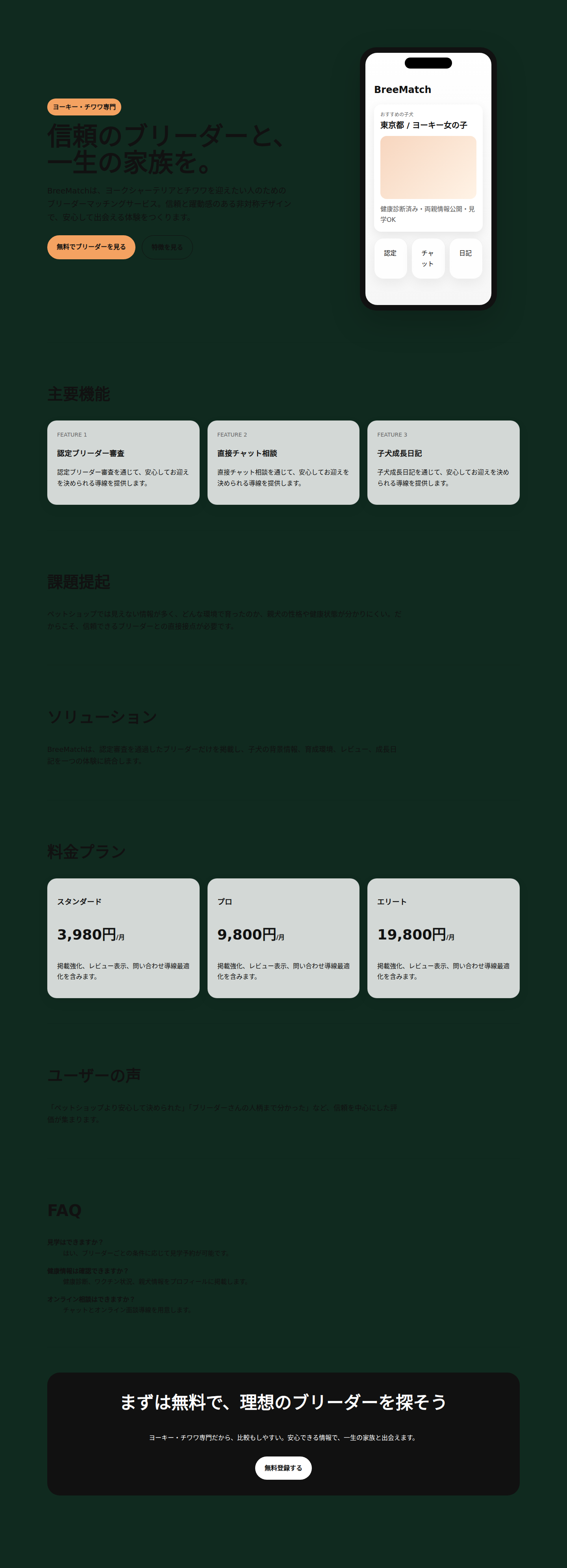 信頼のブリーダーと、一生の家族を。ヨークシャーテリアとチワワに特化した、認定ブリーダーマッチングサービスのデモ。